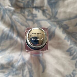 Dior lip gloss coral-tinged pink with soft gold and pale pink shimmer. It is mostly opaque, though some of the natural lip color peeks through.