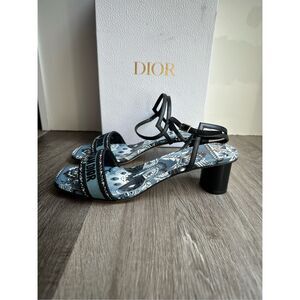 Dior Bandana Embroidered Deep Blue Dway Heeled Sandal Strap Low Heel Pumps EU38/