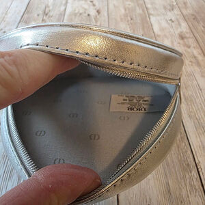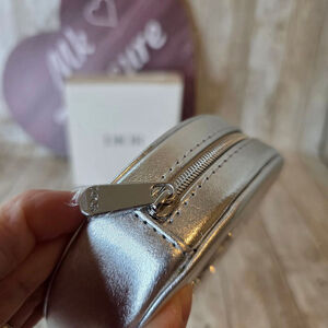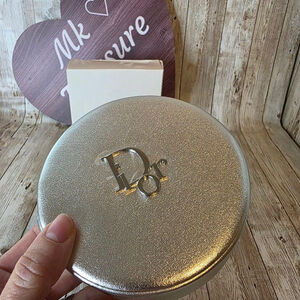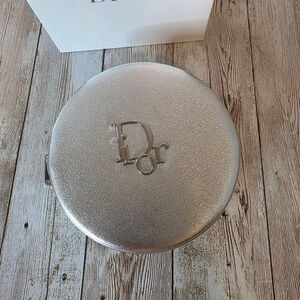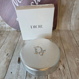 This is a new Dior beauty case, complete with its original box. The case is round, made of silver-colored material with a textured finish. It features a Dior logo on the top and a zipper closure. The interior lining is light gray with Dior logos. The box is white with the Dior logo printed on the side. The item is in pristine condition, showing no signs of wear or damage.