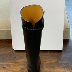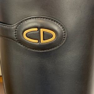Christian Dior's Diorable knee high boots. These boots feature an all over classic black with a gold tone logo for an eccentric ankle boot. Perfect stand out shoes for that accented accessorie in your everyday wardrobe.