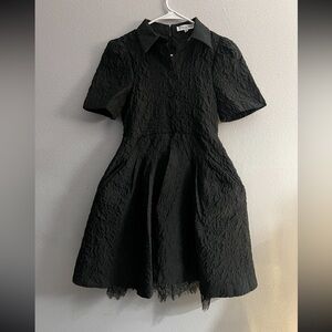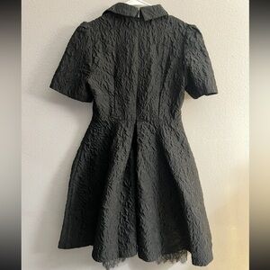 Chic black midi dress with textured fabric. Features short sleeves and a collared neckline. Perfect for elegant occasions.