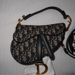 Stylish Dior saddle bag with black monogram design. Features striking gold hardware. Ideal for fashionable events.