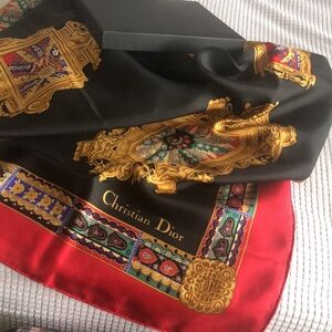 Elevate your style with this luxurious Dior scarf. Featuring a striking black and gold design, this accessory adds elegance to any outfit.