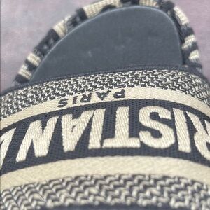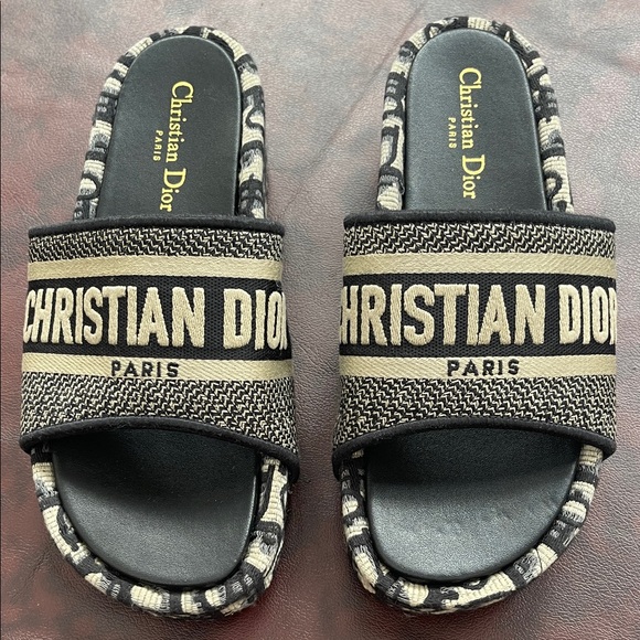 Elegant Dior slides with prominent logo. Black and tan design. Comfortable and stylish. 2” heel height