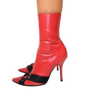 Dior red boots featuring branded bondage belt straps. John Galliano era.