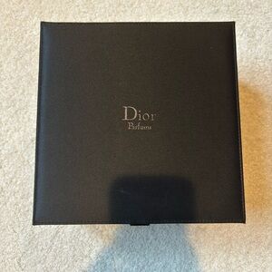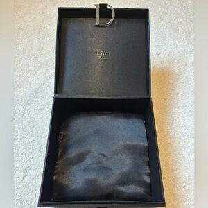 Black Dior box. Satin interior. Silver D hardware. Spacious interior. Includes black satin jewelry cushion. Perfect for makeup and jewelry storage.