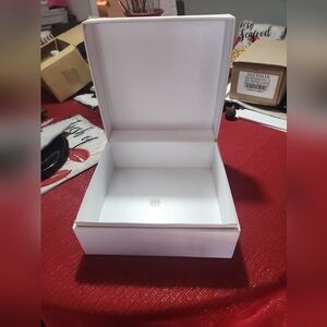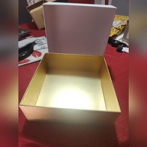 white and gold Dior boxes. the one on the right is hinged leather. the left is more of a cardboard material and the top comes off completely.