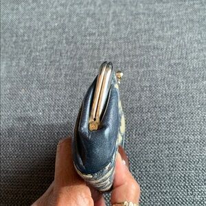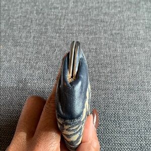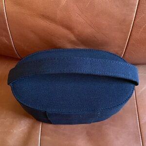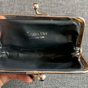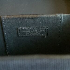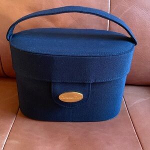 Chic Dior cosmetic case in navy with gold accents. Includes a stylish patterned pouch. Ideal for travel or daily use.