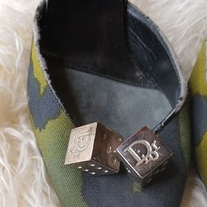 Elegant Dior heels with a unique camouflage pattern. Features green and black tones. Perfect for a bold look.