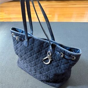 Chic Dior tote with quilted design. Features elegant navy color. Outer coating is gone but otherwise impeccable condition