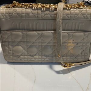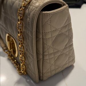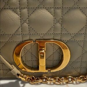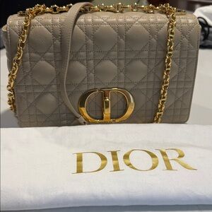 The Dior Caro bag combines modernity with timeless elegance. The style is crafted in sand-colored calfskin distinguished by its original quilted-effect Macrocannage stitching. The bag showcases a flap adorned with an antique gold-finish metal CD twist clasp, inspired by the seal of a Christian Dior perfume bottle. The detachable chain shoulder strap with CD signature links allows the medium bag to be carried by hand, worn over the shoulder or crossbody, and may be replaced by one of the House's wide embroidered straps for day or evening attire.