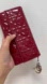 Elegant cherry patent leather clutch with embossed pattern. Features a chic design and metallic charm.