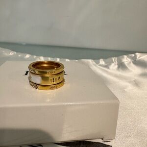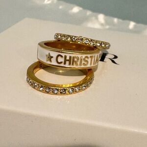 The Dior Code ring set offers a modern and iconic look. Two slender gold-finish metal rings feature a pavé of silver-tone crystals, while the third ring presents a wider silhouette in white lacquer with the Christian Dior signature. The rings can be combined with other Dior Code creations.