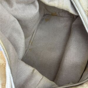 Very good vintage condition. Minor manufacturer glue residue at base near leather trim and also near top base of strap trim. Minor wear to straps and minor wear to canvas. But overall very clean! Interior also shows a few minor yellow marks. Includes dust bag.