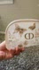 Chic cream cosmetic bag with delicate floral embroidery. Features iconic Dior logo. Perfect for stylish storage.