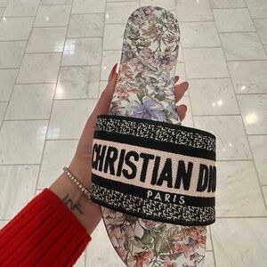 Elegant Dior sandals with floral pattern. Black and cream strap with logo detail. Perfect for stylish outings.
