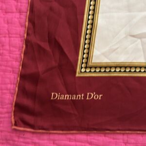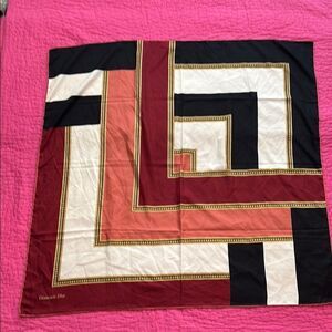 Elegant silk scarf with a bold geometric pattern. Features a mix of red, black, white, and gold. Perfect for adding a touch of luxury to any outfit. silk, no tags, 35x35 inches