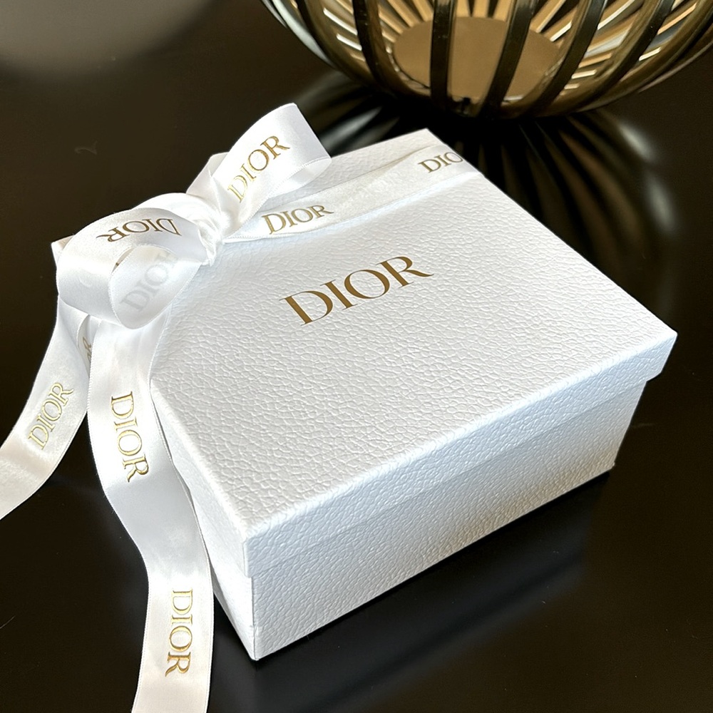 This listing is for one white Dior gift box with white branded ribbon and tissue with logo sticker. All logos in gold. All pieces in excellent condition with no tears or marks. Measures approx. 6.25”L x 7”W x 3.25”D.