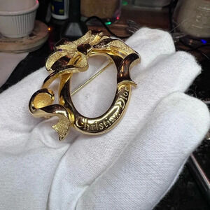 Elegant Dior brooch in a stunning gold finish. Perfect for adding a touch of luxury to any outfit.