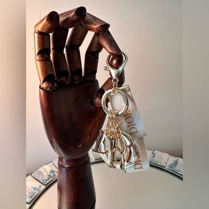 Chic Dior key holder/bag charm with gold tone letters and white ribbon. Stylish and elegant accessory.