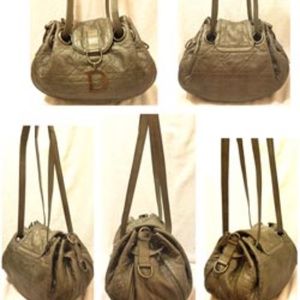 Dior Gray extra-large lamb leather convertible cross body, shoulder, hobo with a flap cover, magnet and pull cord closure. 11.5x15x6 with a 16 strap drop. 1 inside pocket with a zipper closure, 2 inside slip pockets, 1 signature charcoal tone “D” embellishment.