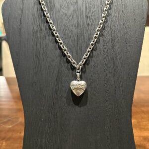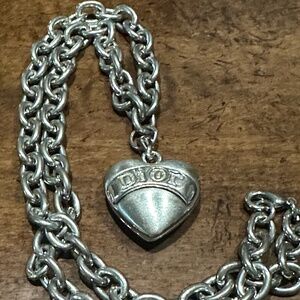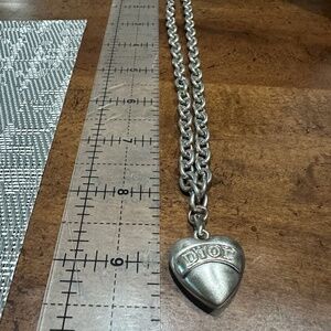 Crafted with a bold, chunky silver-tone chain, this eye-catching piece features a statement heart pendant engraved with “DIOR” on the front. Flip it over to reveal unique heart-shaped cutouts on the back—adding a playful, romantic touch from every angle. 💖