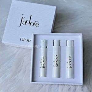 Sophisticated Dior J'adore sample set. Three sleek white bottles in an elegant box.
