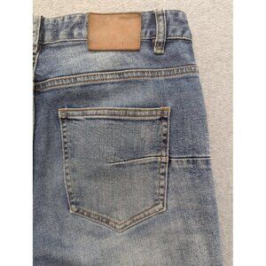 Item: Mens blue denim jeans with a slim fit and distressed fade throughout.