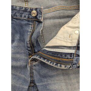 Previously worn with intentional distressed areas and fading on thighs and knees. Small worn-through spots and fraying at a few front distress points and light wear at leg hems. Fabric otherwise solid and soft; zipper and button function properly.