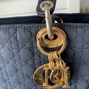 Elegant black quilted handbag. Features gold-tone hardware. Iconic Dior charm detail.