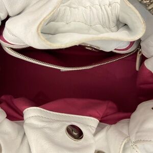 Step into timeless classic elegance with this authentic Christian Dior Le Trente handbag / shoulder bag, crafted from luxurious white lambskin leather and accented with shiny silver-tone hardware. Featuring Dior’s signature soft silhouette and gathered pleats, this iconic shoulder bag is lined with a stunning rich pink interior—a bold and beautiful contrast that elevates the design, and HTF Y2K color combination. Authenticated by Authentic Detective and comes with a copy of the COA. (The scratch out in the picture of the COA is to prevent scammers from using the COA as their own. The one sent to the buyer will not be scratched out.)