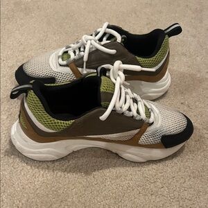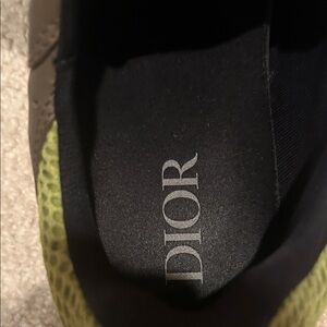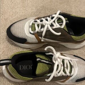 Stylish Dior men's sneakers. Features white mesh upper. Brown and green accents. Black detailing. Comfortable and trendy.
