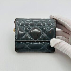 Elegant Dior wallet in glossy gray patent leather. Features signature quilted design and gold-tone hardware.