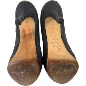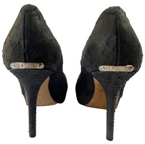 Dior python embossed suede leather peep toe heels. Some wear on soles, insoles and heels (please see all pictures) All photos are all of the actual item take by me, no stock photos.