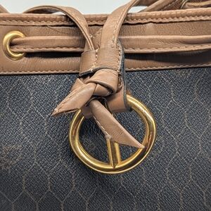 Classic Dior bucket bag in navy monogram coated canvas with tan leather trim and gold-tone hardware. Features a drawstring closure, adjustable shoulder strap, and spacious interior. Comes with a matching zip pouch for added convenience.