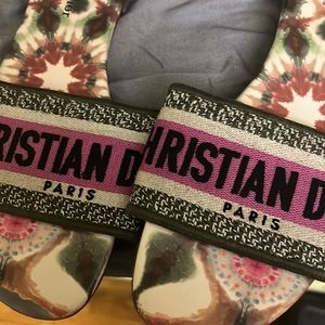 Stylish Dior sandals with multicolor design. Features pink and black accents. Comfortable and chic.