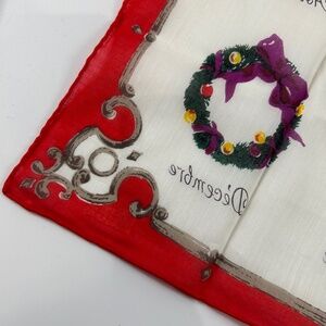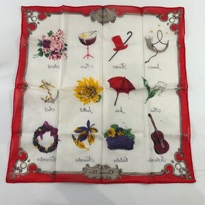 Elegant Dior scarf featuring a vibrant red border. Decorated with colorful illustrations and months of the year. Perfect accessory for any outfit.Small size