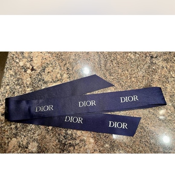 Elegant navy ribbon with repeating DIOR logo. Luxurious satin finish. Perfect for gift wrapping or crafting.