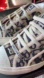 Stylish Dior sneakers with navy and cream design. Features logo pattern and lace-up closure.