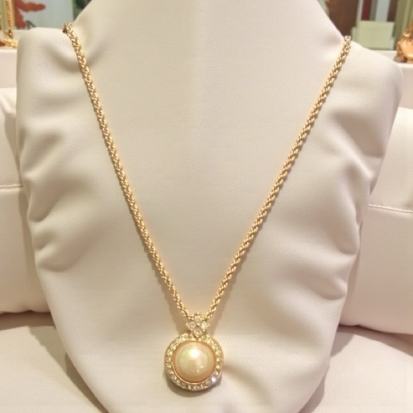 This stunning gold pendant necklace adds a touch of elegance to any outfit. Has some scratches on the hardware no stones missing.