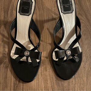 Patent leather thong heeled sandals with bow detail and silver Dior hardware. 3.5 inch heel and leather lining and sole. Size 39.