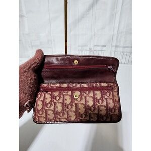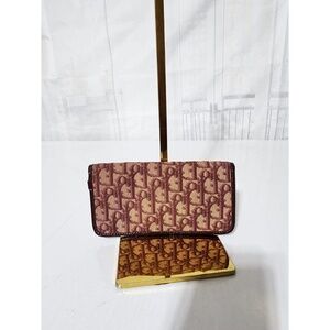 This Dior wallet showcases the iconic oblique pattern in pink and mauve tones, complemented by gold-toned hardware. Its flap closure design offers a classic and elegant look, embodying Dior's signature style.