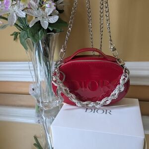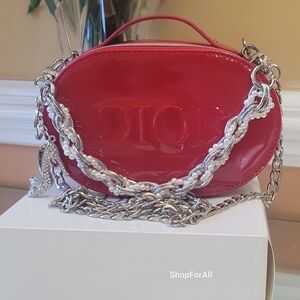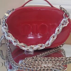 Elevate your style with this stunning red patent leather bag from Dior. Featuring a chic silver chain strap, this bag is perfect for any occasion.