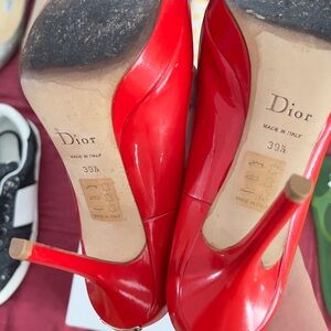 Elevate your style with these striking red heels from Dior, featuring a glossy patent finish and a sleek stiletto design. The pointed toe and slip-on style offer a timeless elegance, perfect for formal occasions. Worn these once in Vegas for my bachelorette.. selling them real low for there are obvious scuffs.. They are high but quite comfy