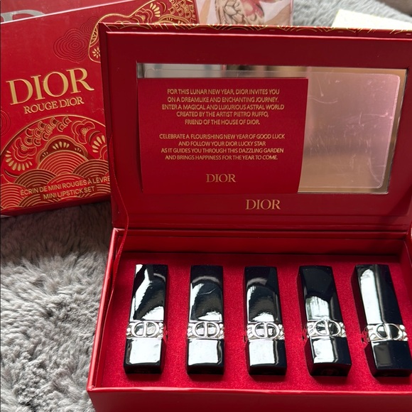 Luxurious Dior set with five mini lipsticks. Elegant black and silver casings. Perfect for any occasion.