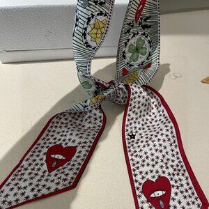 Dior silk twilly scarf featuring the whimsical "Le Soleil" print with charming motifs like hearts, bees, and stars.