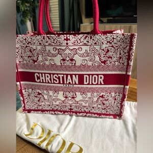 Elegant Dior Book tote in size small with intricate redish and white design. Features sturdy handles and spacious interior. Comes with dust bag & authenticity card.