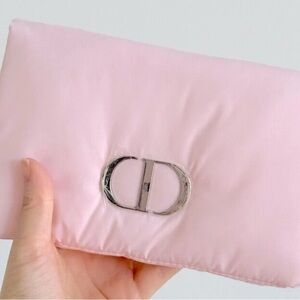 Chic Dior pouch in soft pink. Features a sleek silver accent. Ideal for stylish storage.