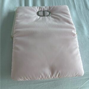 Chic Dior clutch in soft pink satin. Features elegant silver-tone logo detail. Perfect for evening outings.