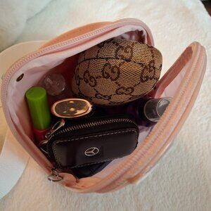 Contents In Bag: Large Sunglass Case, Car Key Case, Mini Wallet (under key case) Mascara, Luminizer, Hand Sanitizer Spray, Perfume Spray ... and I could stuff a couple more small things in there!!